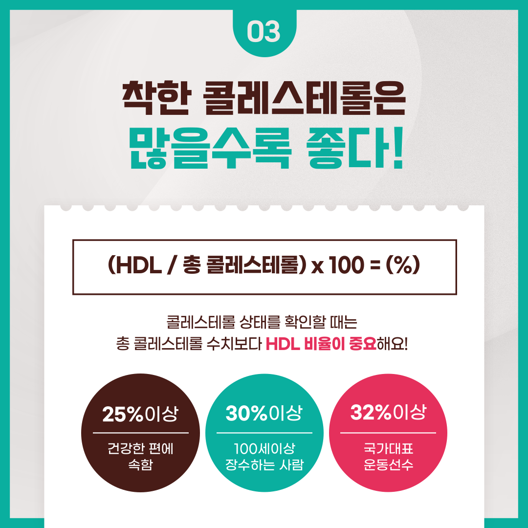 - HDL (High-Density Lipoprotein) – 좋은 콜레스테롤: 혈관 속의 나쁜 콜레스테롤을 제거해 동맥경화를 예방합니다. 수치가 높을수록 좋습니다.